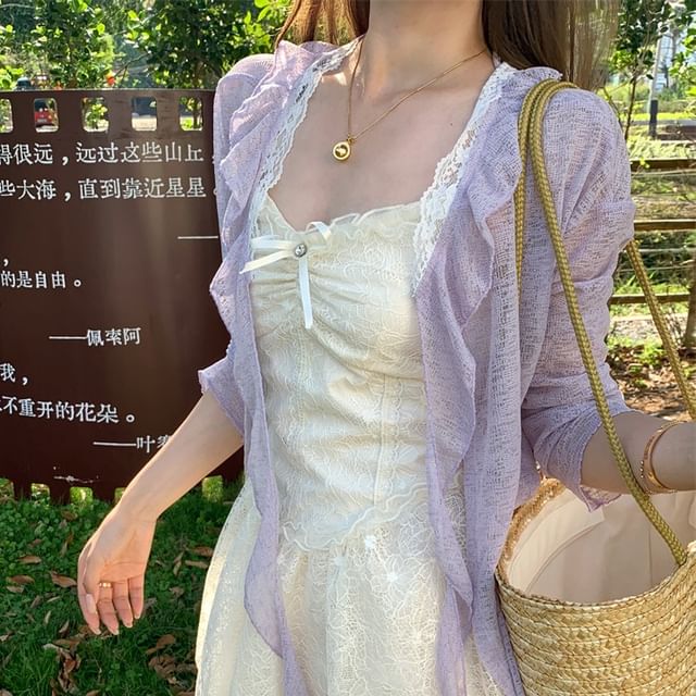 Spaghetti Strap Bow Ruched Lace Panel Mini A-Line Dress / Melange Ruffle Trim Cardigan