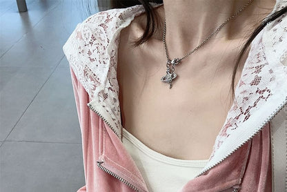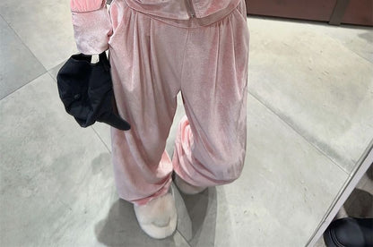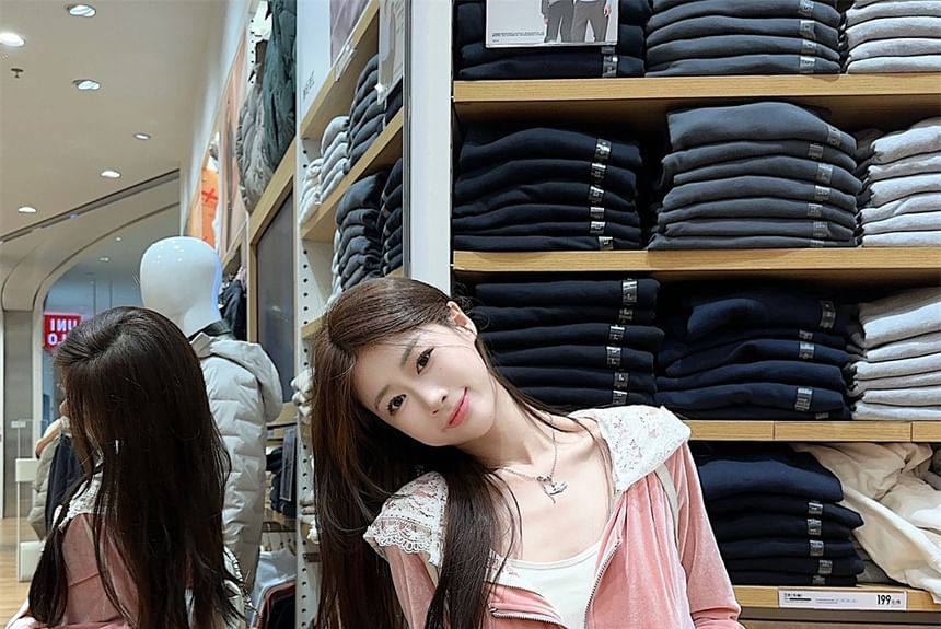 Mock Two-Piece Lace Panel Velvet Zip-Up Crop Hoodie / High Waist Plain Wide Leg Pants