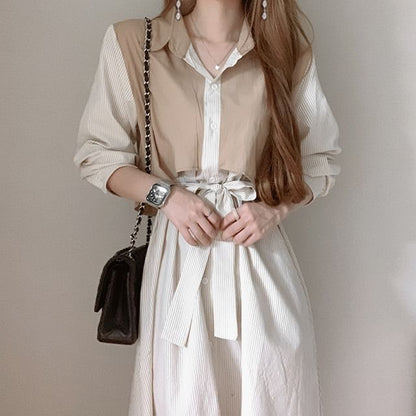 Mock Two-Piece Long-Sleeve Striped A-Line Shirt Dress