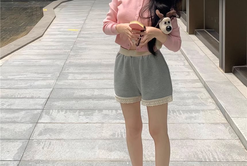 Round Neck Plain Cardigan / V-Neck Plain Padded Panel Lace Camisole Top / High Waist Panel Lace Sweat Shorts