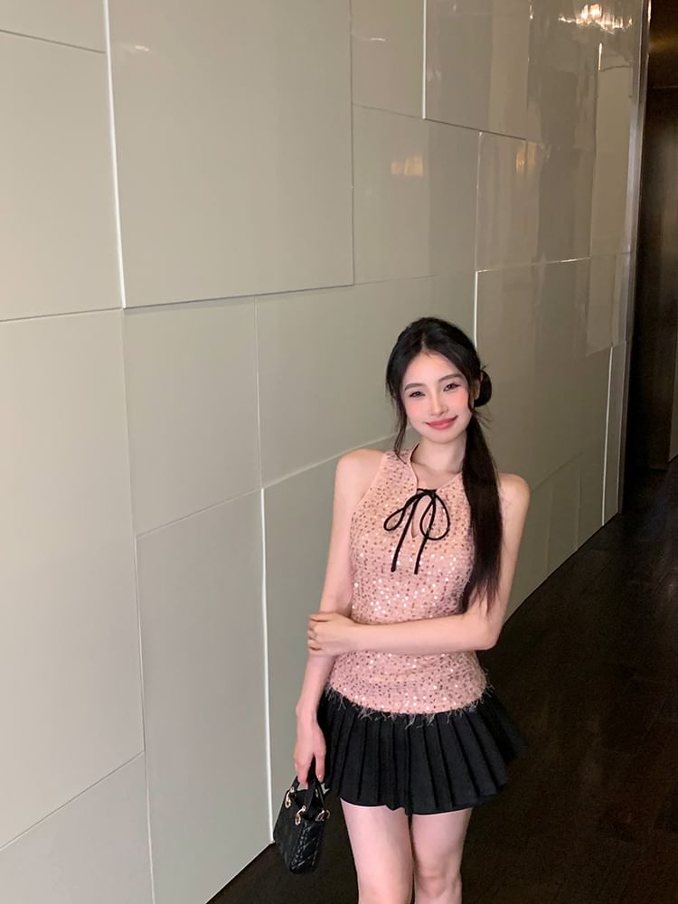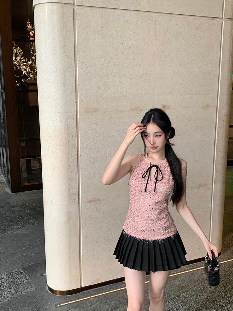 Sleeveless Tie Neck Sequin Top