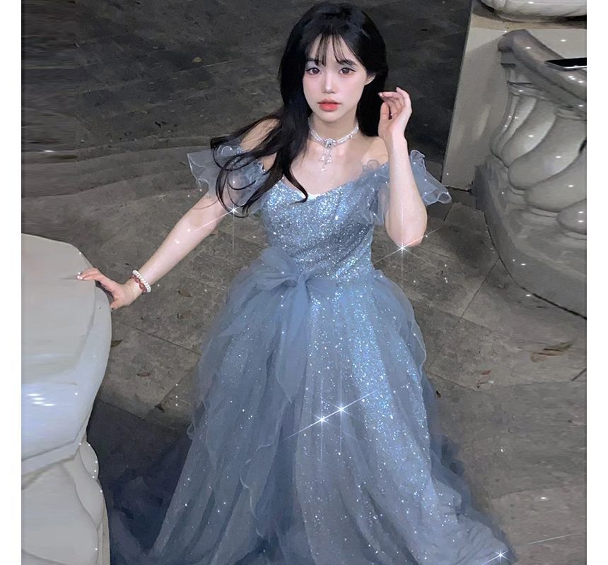 Off Short-Sleeve Mesh Panel Shoulder Gown Evening Glitter A-Line