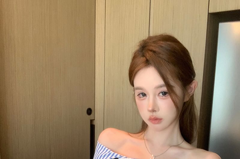 Off-Shoulder Flared-Sleeve Striped Blouse Lace-Up Cropped