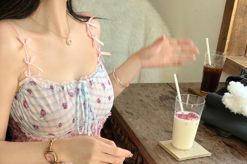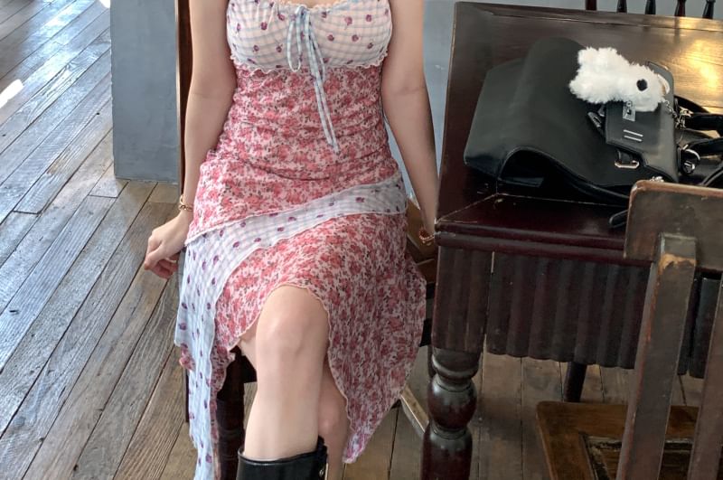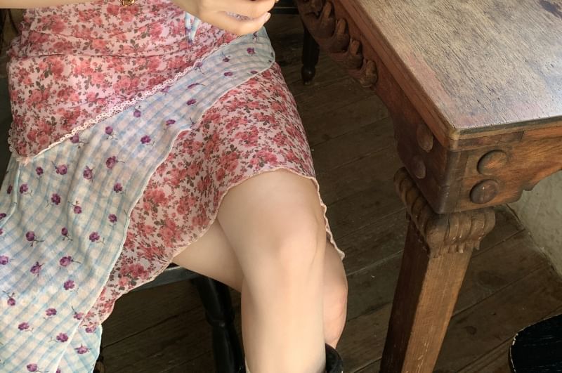 Panel Floral Print Strap Asymmetrical Bodycon Spaghetti Mini Dress