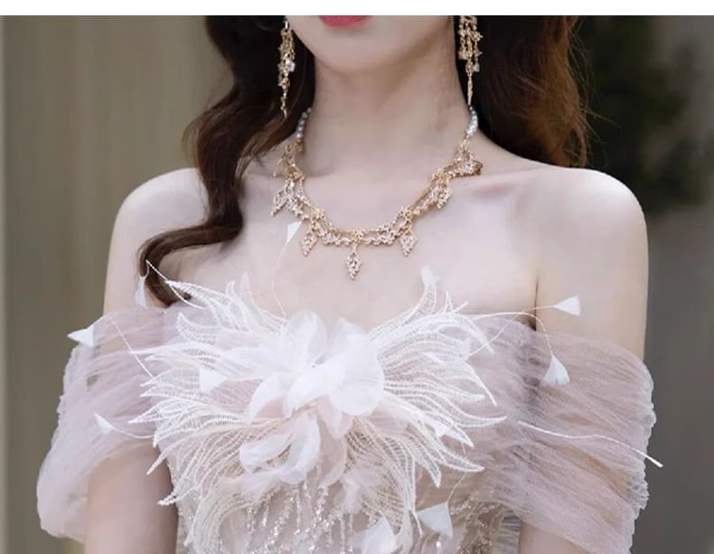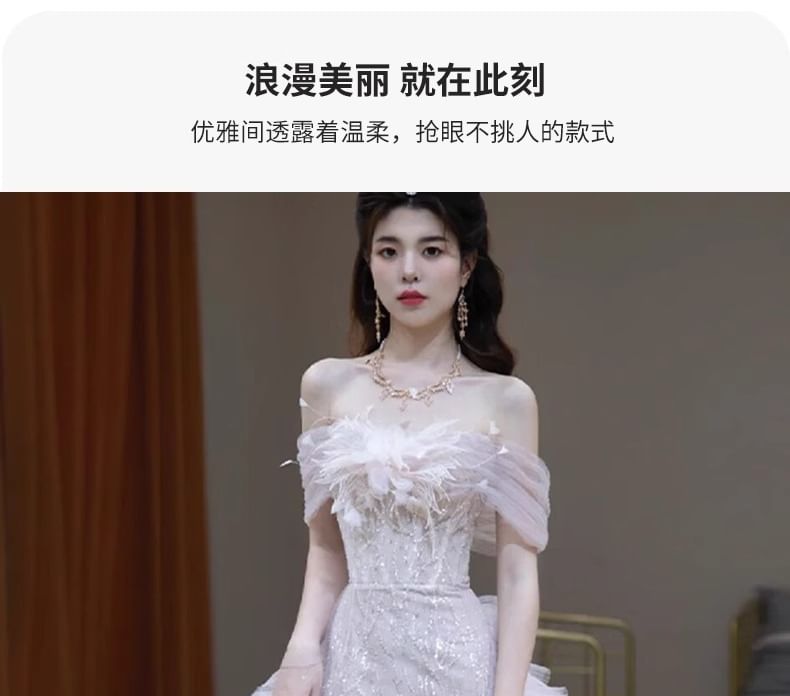 Off-Shoulder Sequin Mesh Panel Flower Accent Mermaid Evening Gown