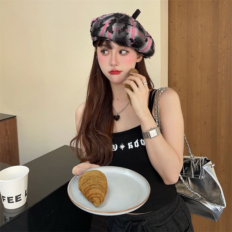 Distressed Plaid Beret