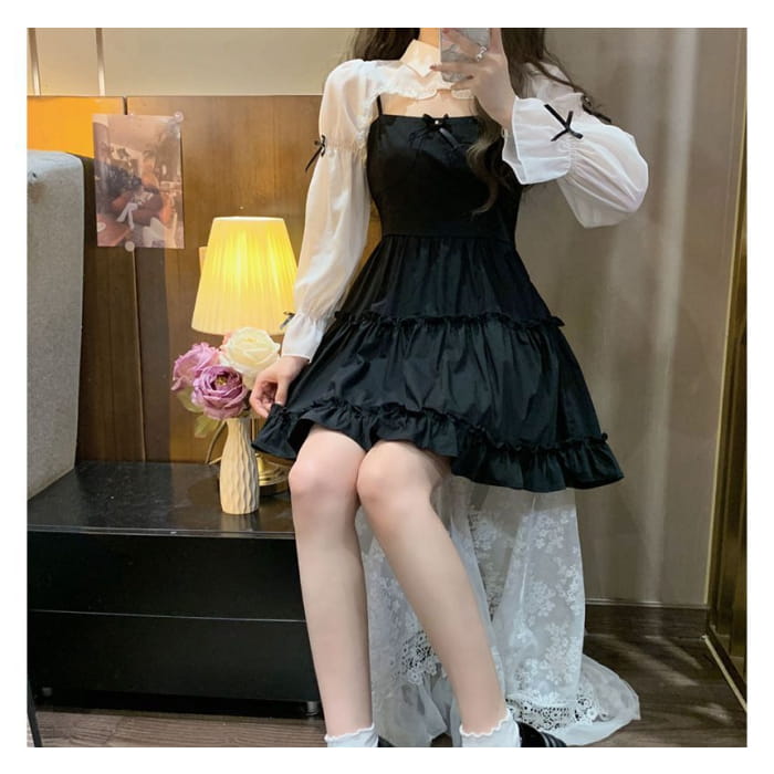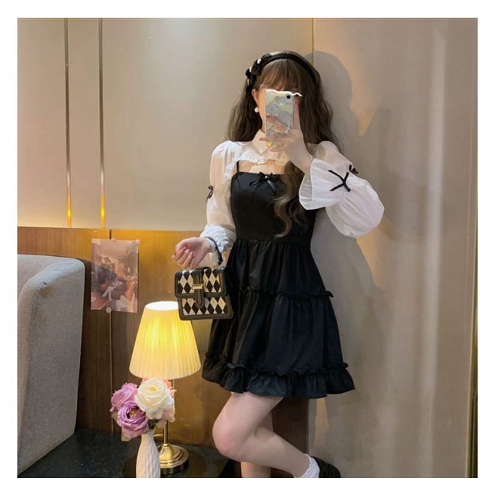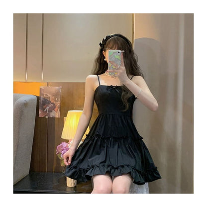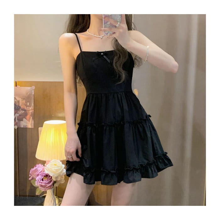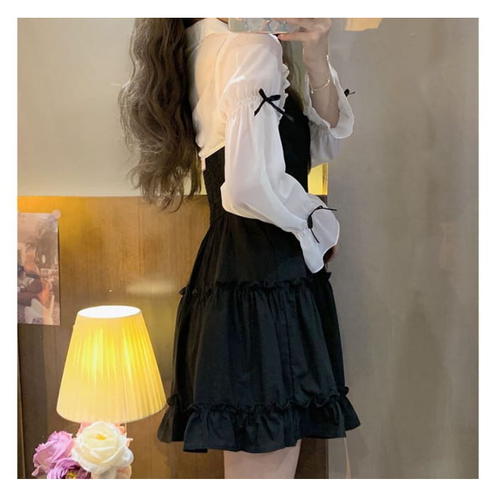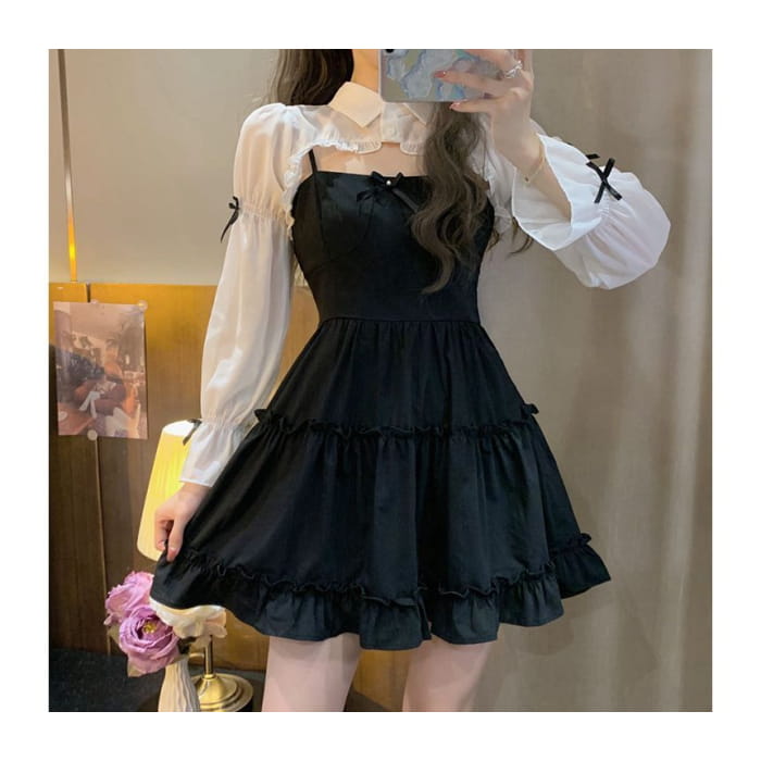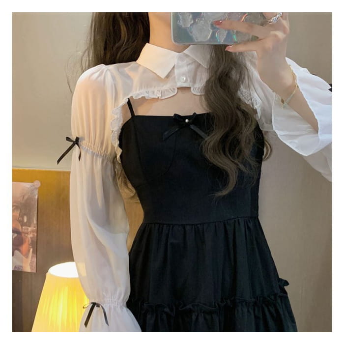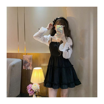 Plain Bow Ruffle Crop Shirt / Spaghetti Strap Mini A-Line Dress
