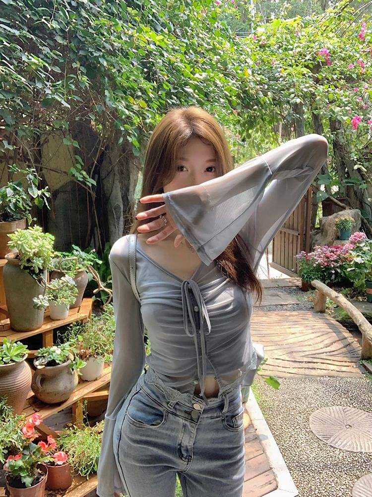 Long-Sleeve V-Neck Plain Sheer Top / Camisole Top