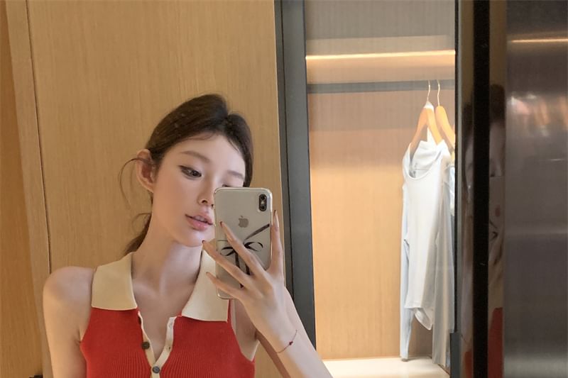 Sleeveless Two Tone Ribbed Knit Mini Sheath Polo Dress