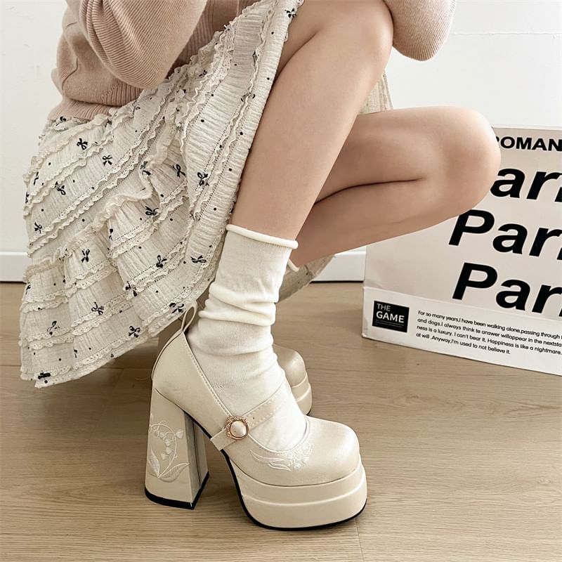 Pumps Mary Embroidered Jane Platform Bow Block Heel Floral