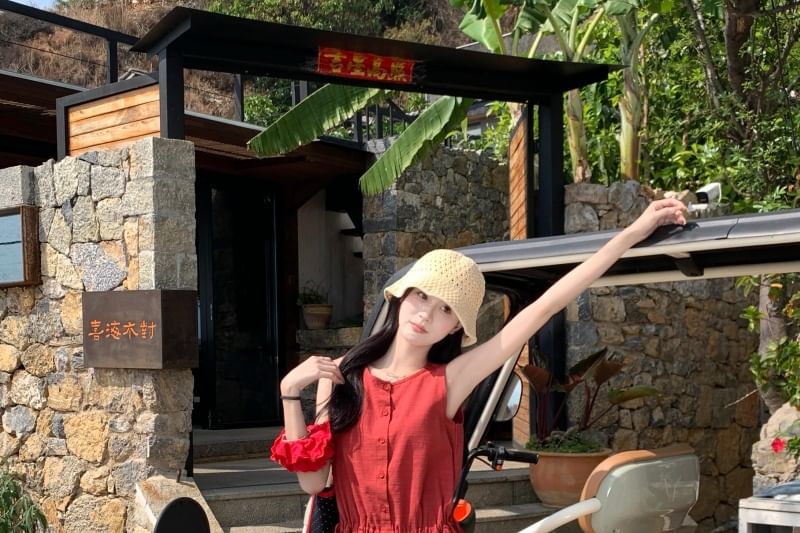 Round Button Neck Mini Sleeveless A-Line Dress Plain