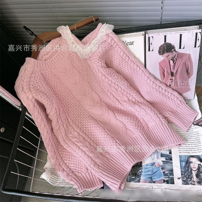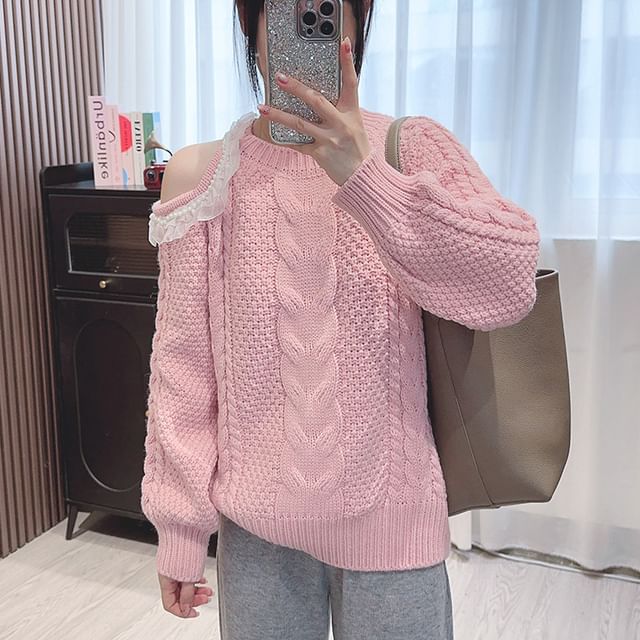 Round Neck Cold-Shoulder Plain Beaded Ruffle Trim Sweater