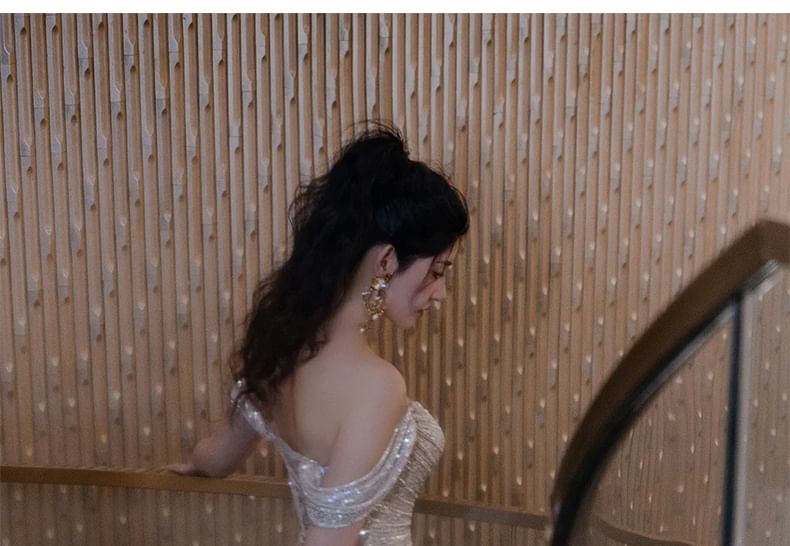 Sleeveless Off Shoulder Plain Sequin Ruched Slit Sheath Evening Gown