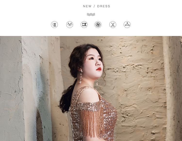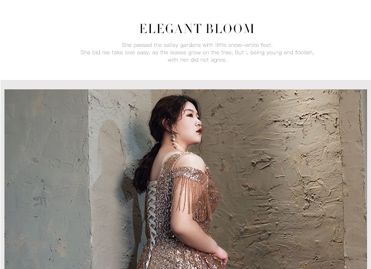 Plus Size Cold-Shoulder Sequin Fringed A-Line Evening Gown