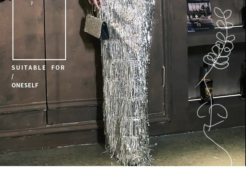 Sequined Velvet Tasseled Panel Off-Shoulder Gown Evening A-Line