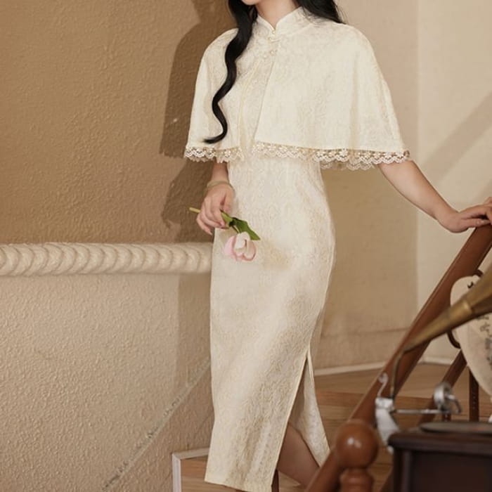 Set: Halter-Neck Slit Midi Lace Qipao + Lace Trim Cape