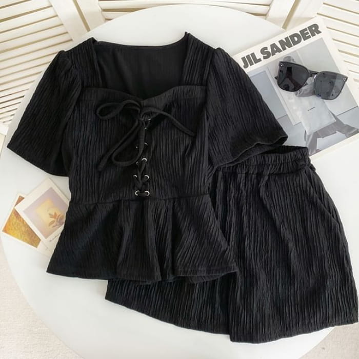 Set: Short-Sleeve Square Neck Plain Lace Up Panel Top + Elastic Waist Shorts