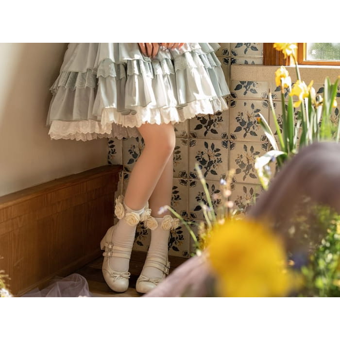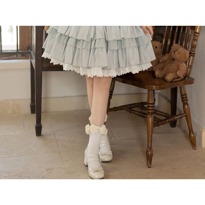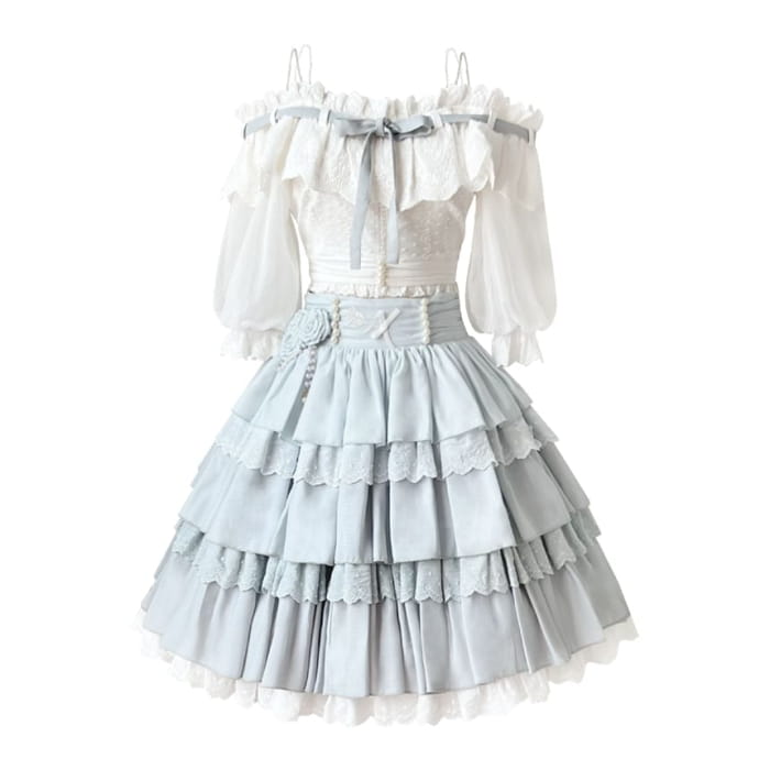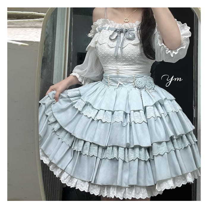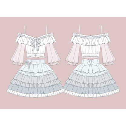 Lolita Short-Sleeve Cold Shoulder Bow Top / Mid Waist Mini Tiered Skirt / Set