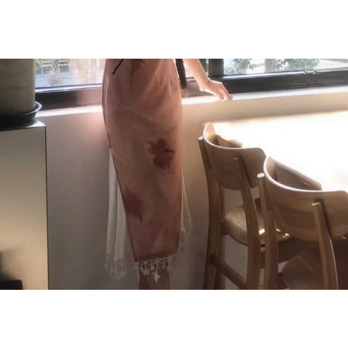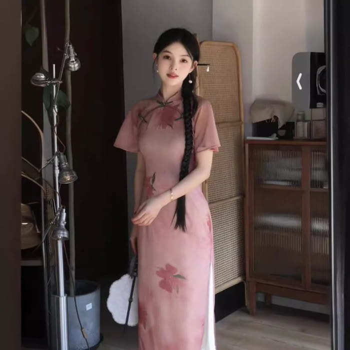 Short Sleeve Mandarin Collar Floral Print Midi Qipao
