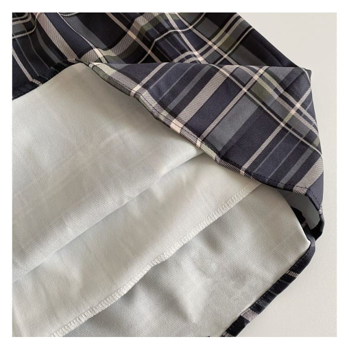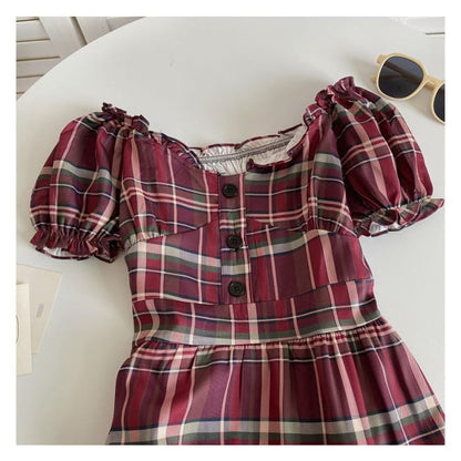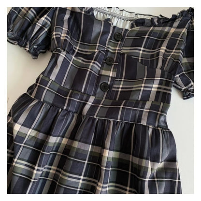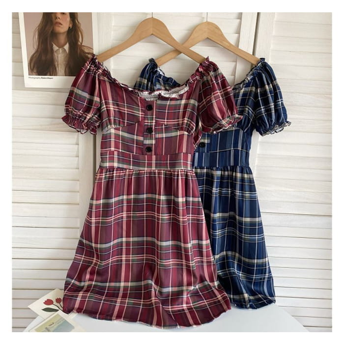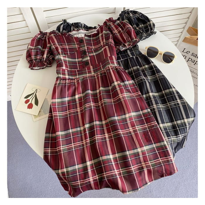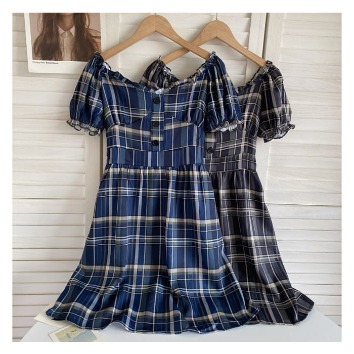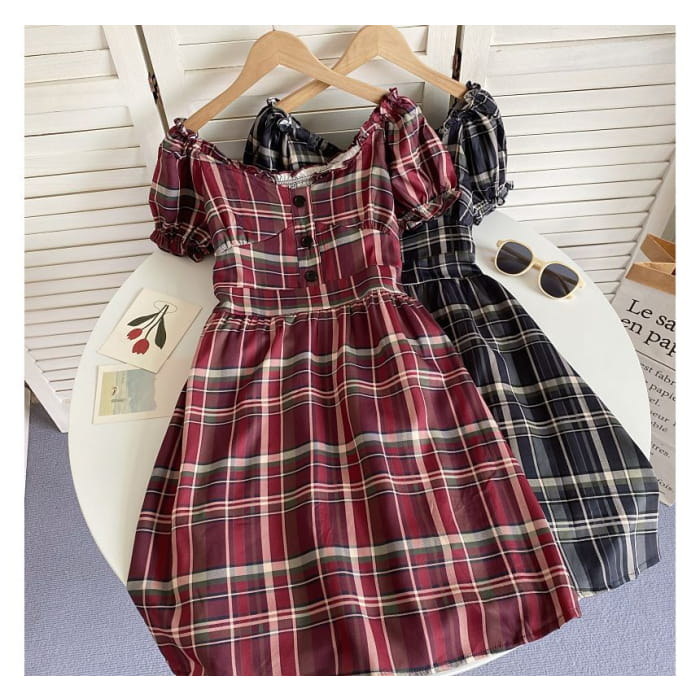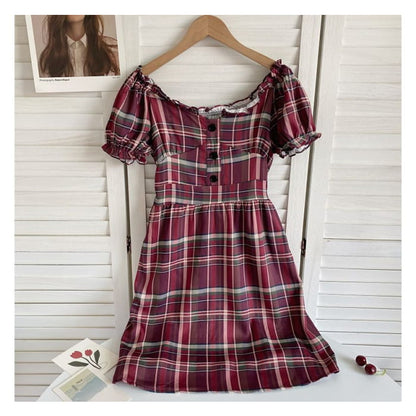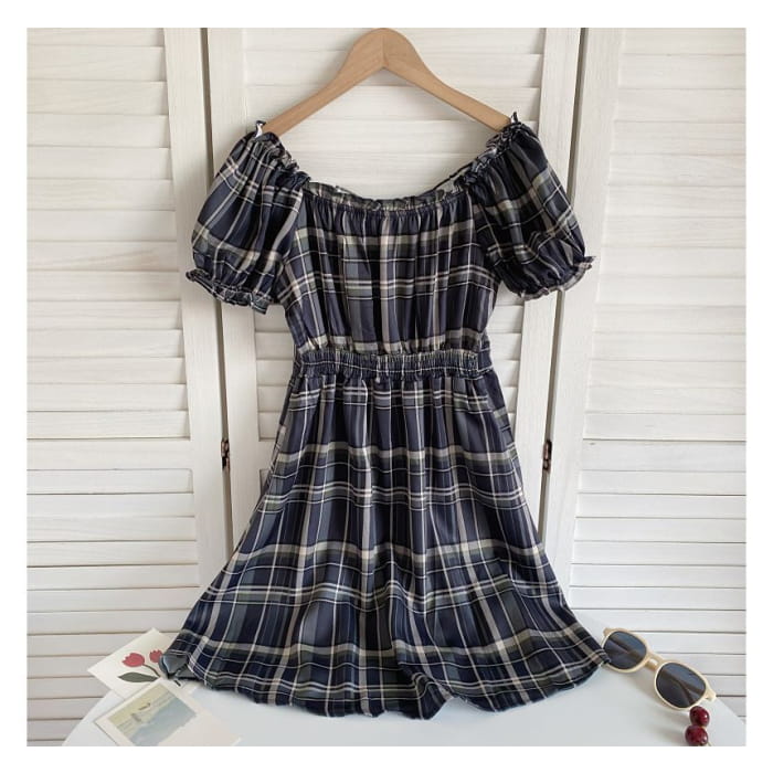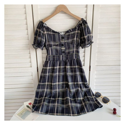 Short-Sleeve Off-Shoulder Plaid Mini A-Line Dress