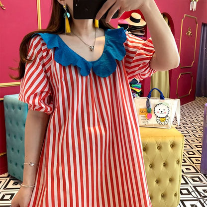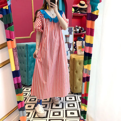 Short-Sleeve Ruffle Striped Maxi A-Line Dress