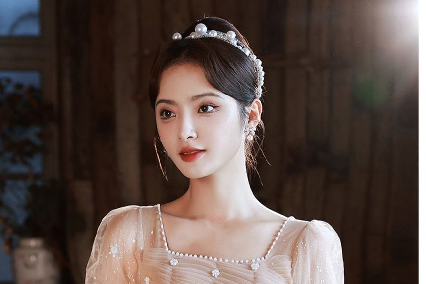 Short-Sleeve Square Neck Glitter Faux Pearl Trim Ruched Mesh A-Line Evening Gown