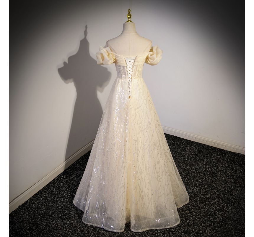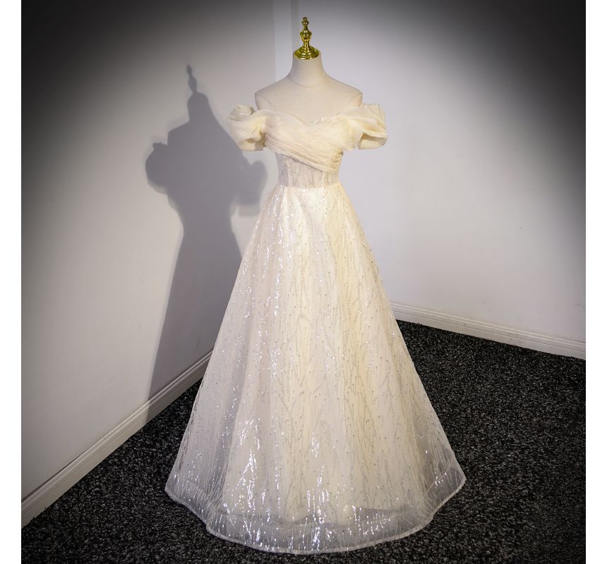 Short-Sleeve Off Shoulder Plain Sequin Ruched Mesh A-Line Evening Gown