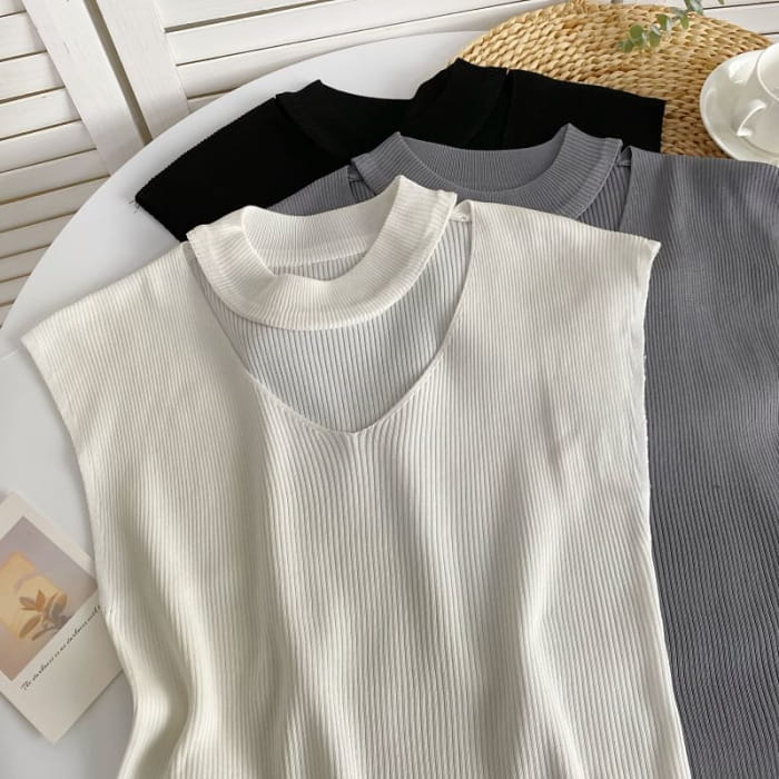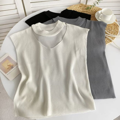 Sleeveless Mock Neck Plain Cutout Ribbed Knit Top