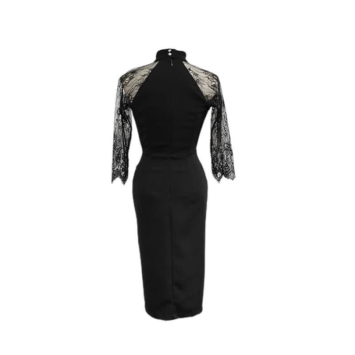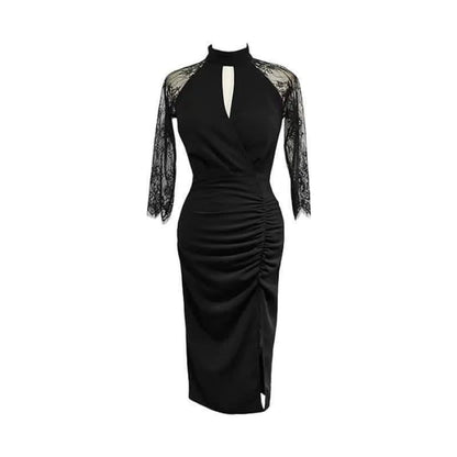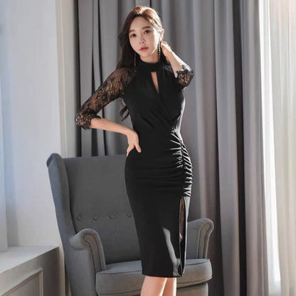 Slim Hollow Out Lace Sleeve Ruffled Split Black Dress