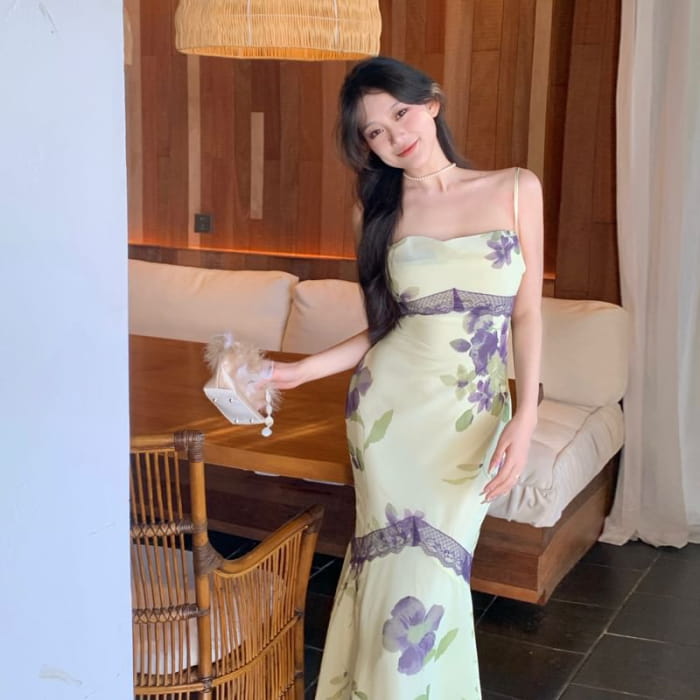 Spaghetti Strap Cowl Neck Floral Print Lace Trim Open Back Maxi Mermaid Dress