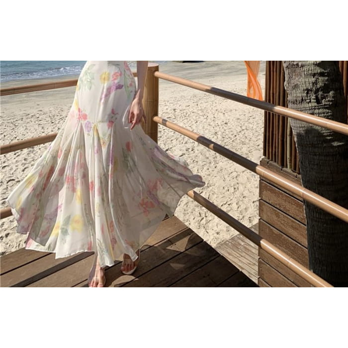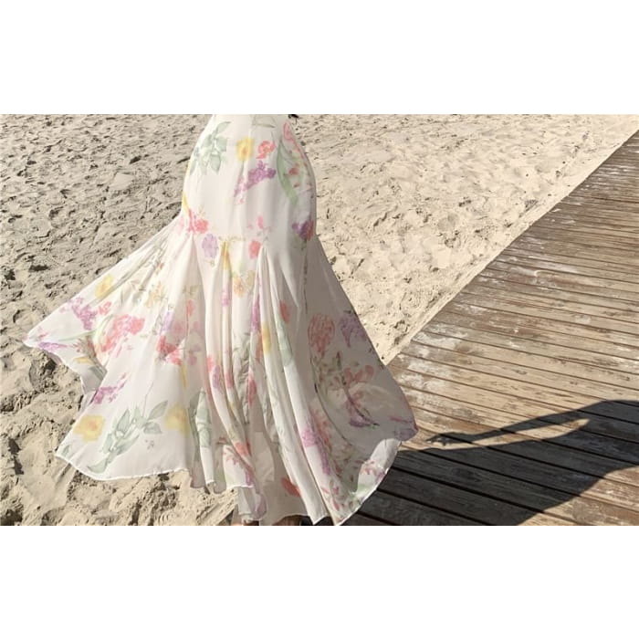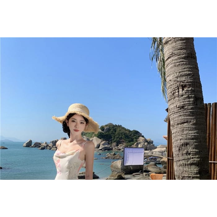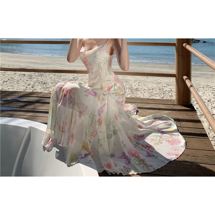 Spaghetti Strap Cowl Neck Floral Print Open Back Maxi Mermaid Dress