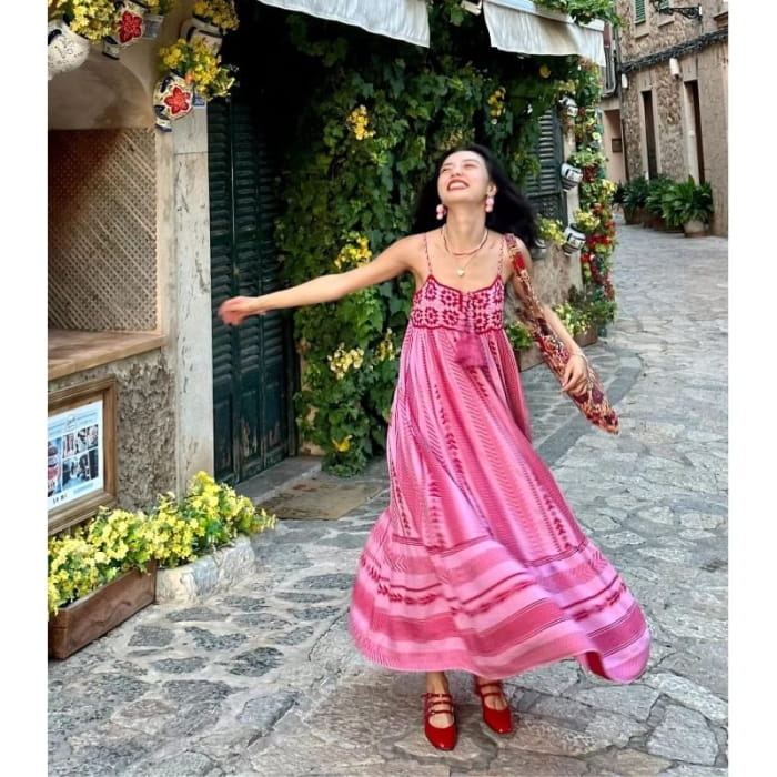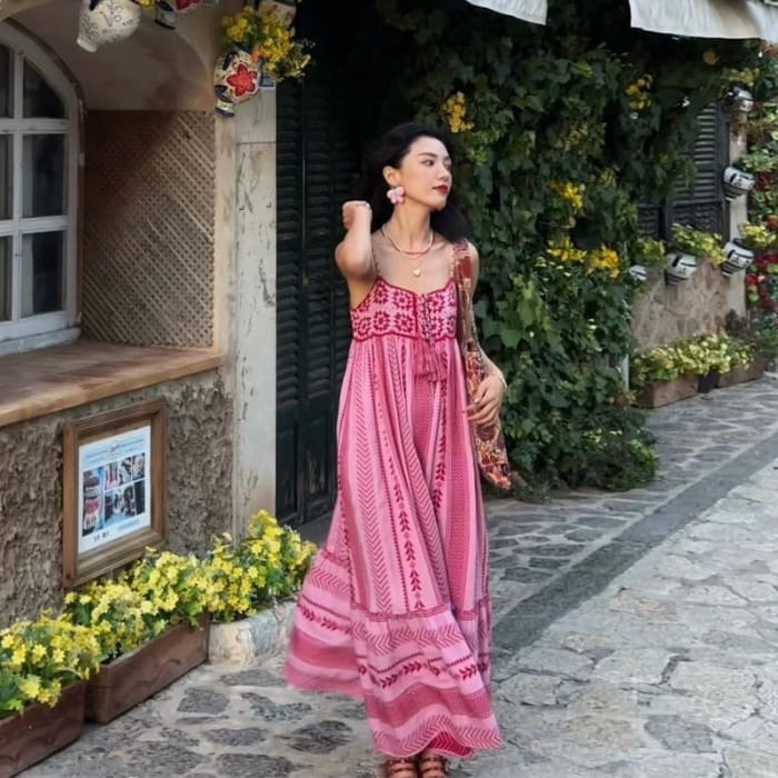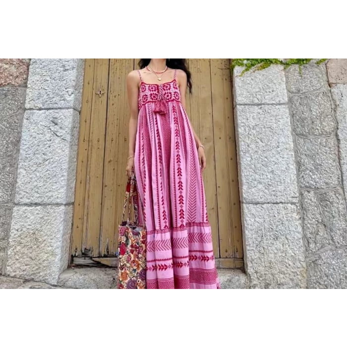 Spaghetti Strap Floral Embroidered Crochet Lace Panel Tasseled Midi Sundress