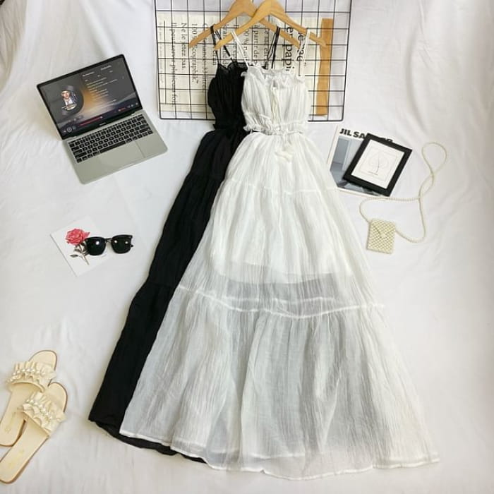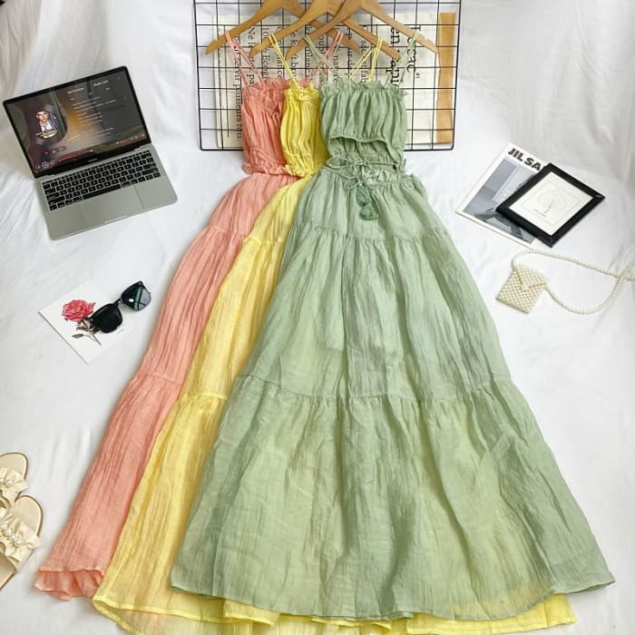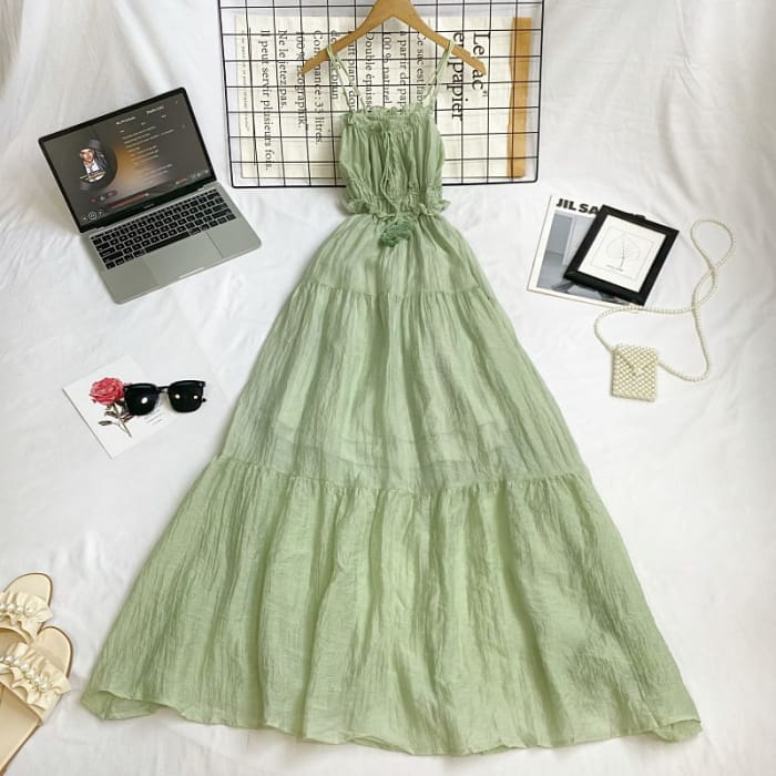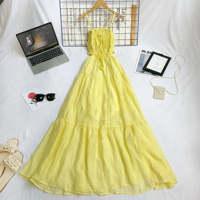 Spaghetti Strap Plain Tiered Cutout Tie-Up Maxi A-Line Dress