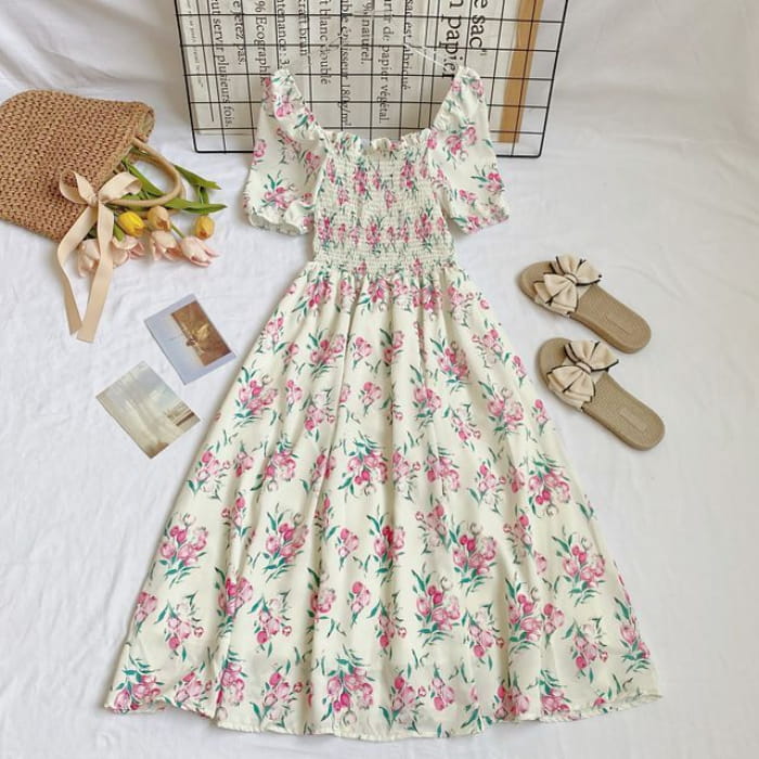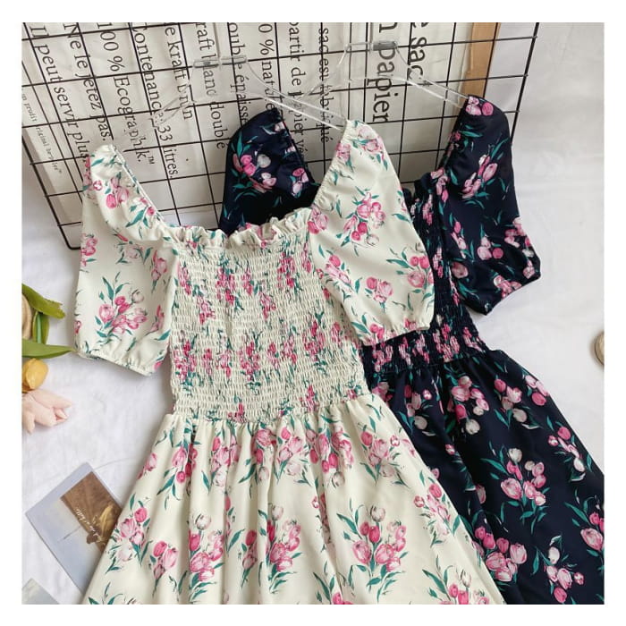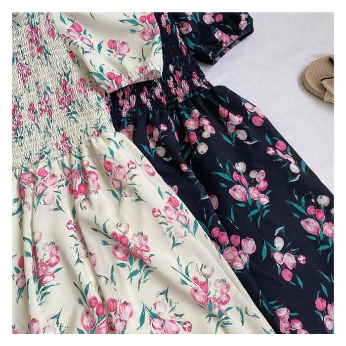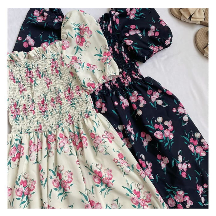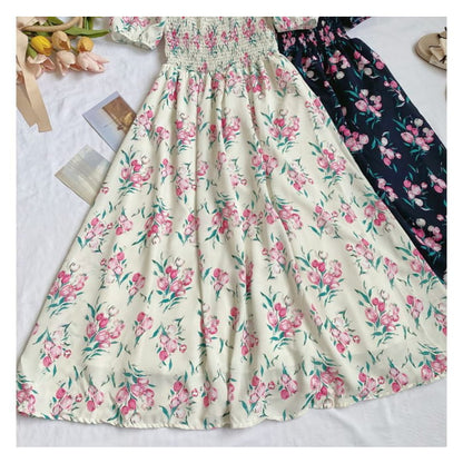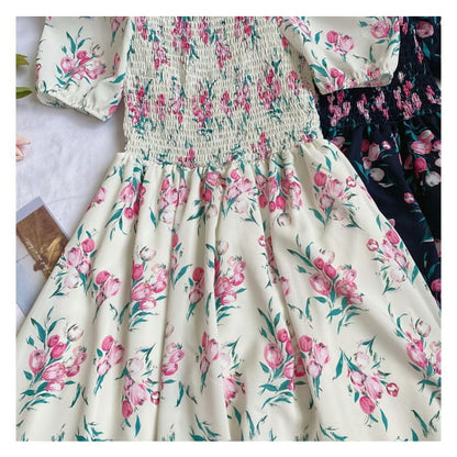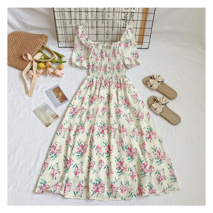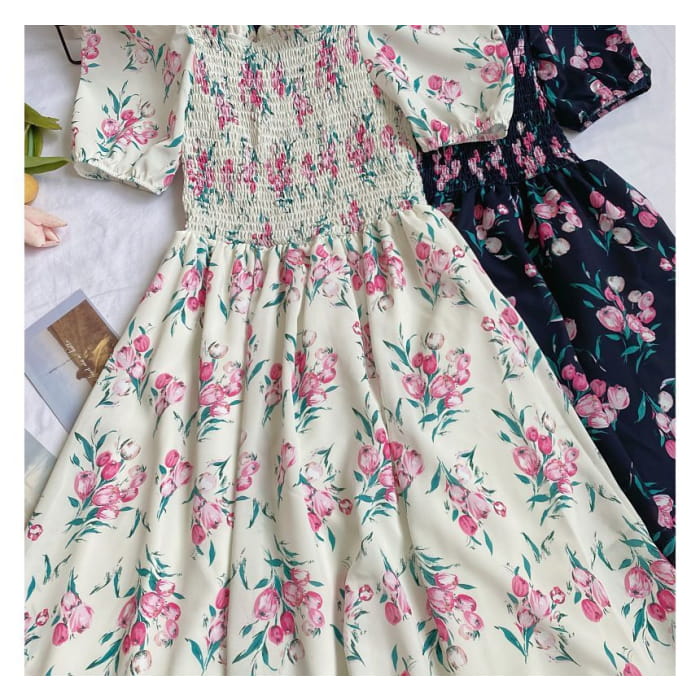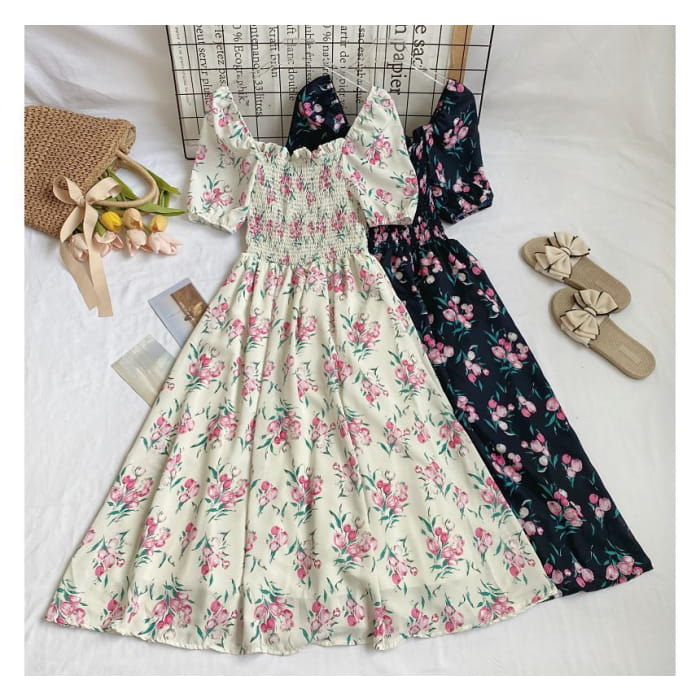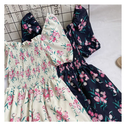 Square-Neck Puff-Sleeve Ruched Floral A-Line Dress