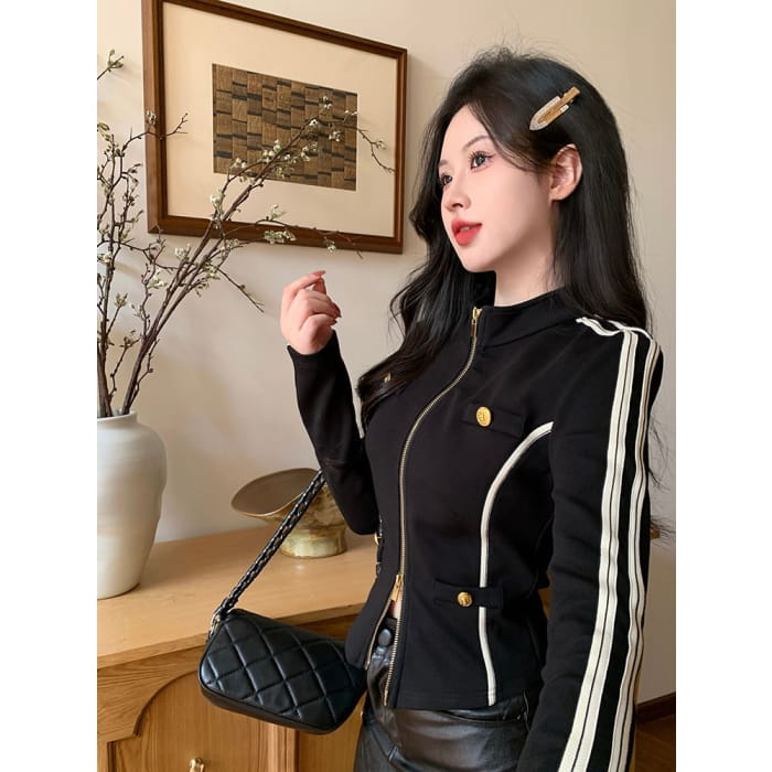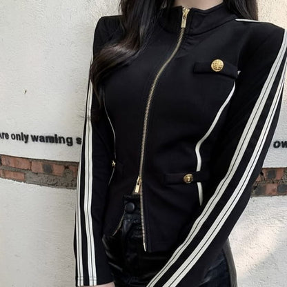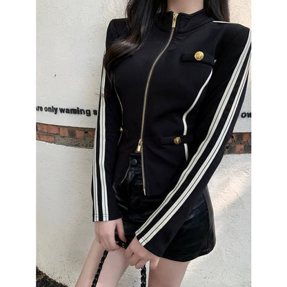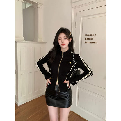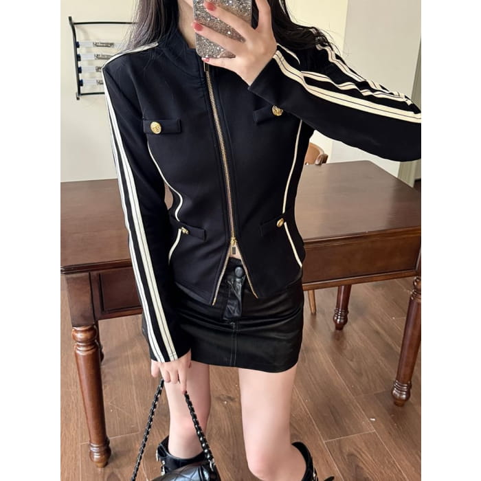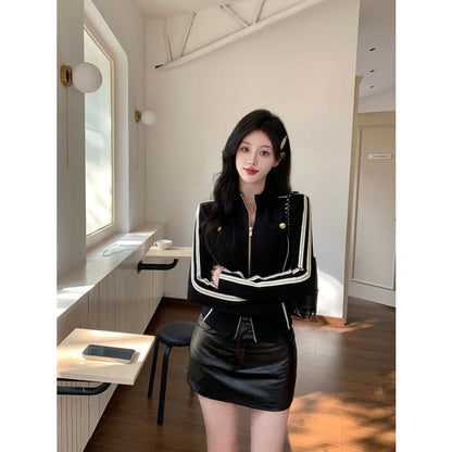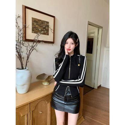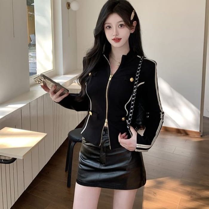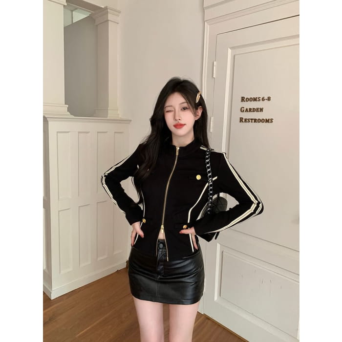Stand Collar Striped Zip Jacket / Mid Rise Faux Leather Mini Pencil Skirt