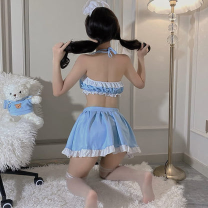 Sweet Blue Lace Up Ruffled Maid Skirt Lingerie Stockings Set