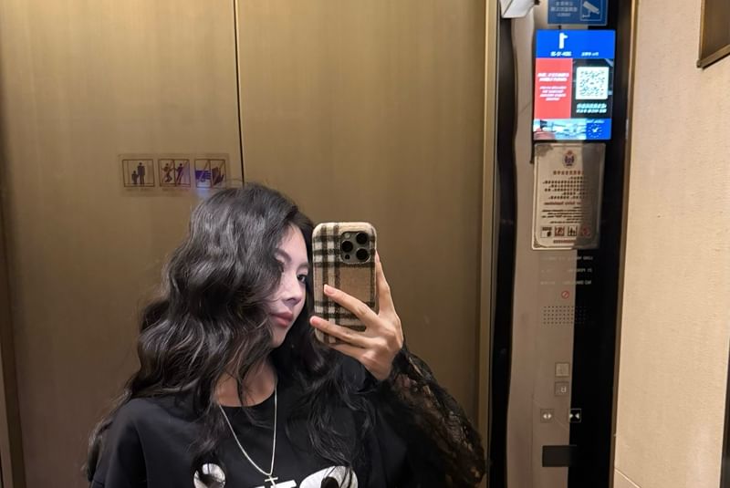 Mock Two-Piece Long-Sleeve Crew Neck Lettering Lace Panel Tee