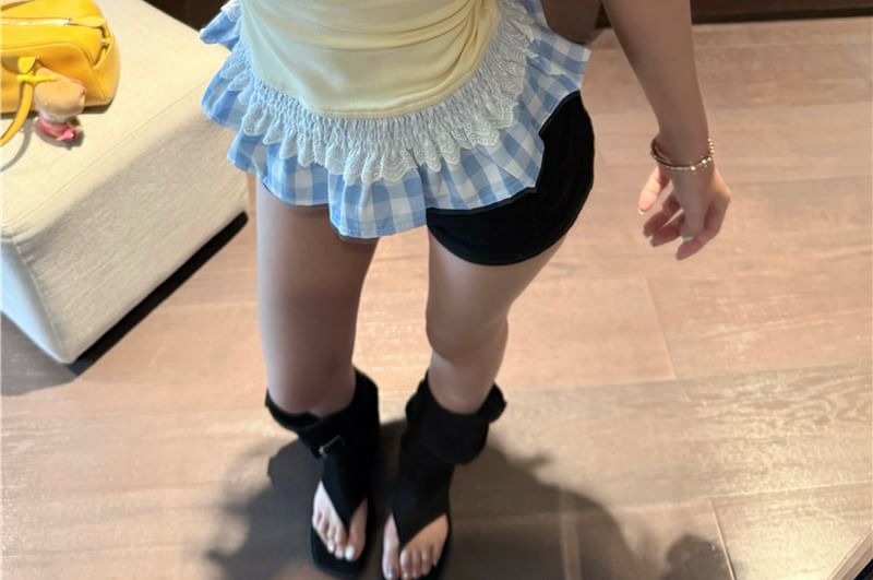 Two-Piece Ruffle Scoop Neck Mock Trim T-Shirt Fit Short-Sleeve Slim Plaid Panel