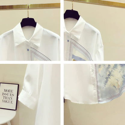 Elevate your wardrobe with our White Irregular Painting Print Chiffon Lapel Shirt. Made with high-quality chiffon fabric, this shirt features a unique and elegant painting print design. The lapel collar adds a touch of sophistication while the irregular hemline adds a playful twist. Perfect for any occasion, this shirt will make you stand out in style.