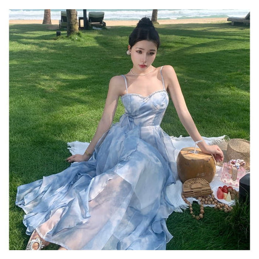 Robe mi-longue à bretelles spaghetti et à volants, teinte par nouage