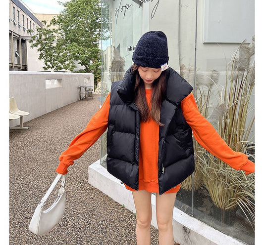 Stand Collar Plain Zip Puffer Vest / Long Sleeve Collared Plaid Shirt
