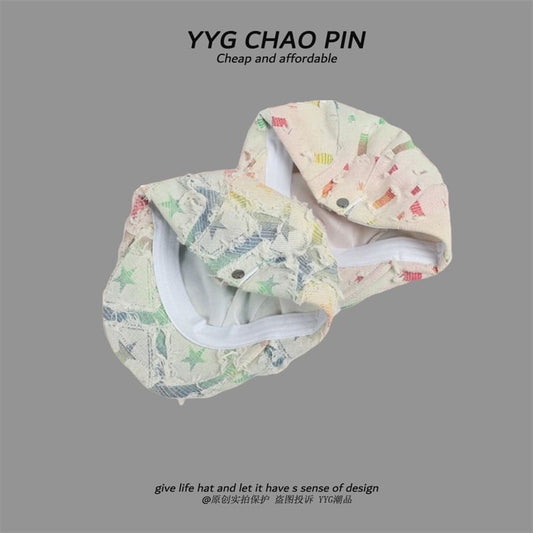 Star Cap Gradient Print Newsboy / Fringed Distressed Denim Trim