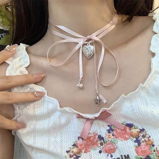 Collier ras du cou avec pendentif en forme de cœur et ruban