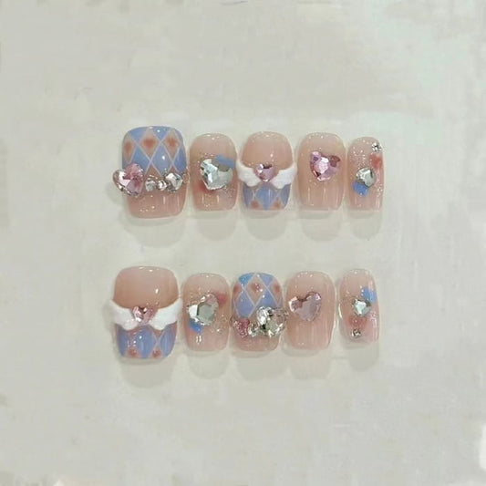 Ongle à coller avec strass en forme de cœur et motif argyle
