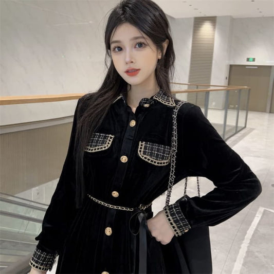 Long Sleeve Collared Plaid Button Panel Velvet Midi A-Line Dress