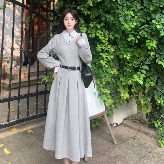 Long Sleeve Contrast Collar Mock Two Piece Corduroy Midi A-Line Dress