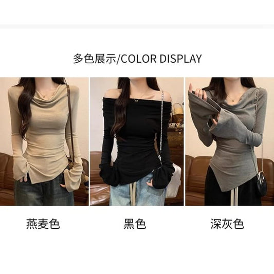 Long Sleeve Cowl Neck Plain Asymmetrical Top