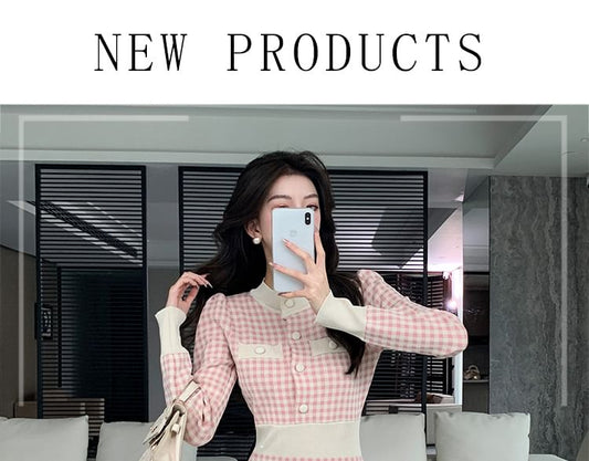 Long-Sleeve Henley Plaid Midi Sheath Dress