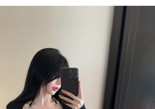 Long-Sleeve Halter Neck Off-Shoulder Plain Asymmetrical Slim Fit Tee