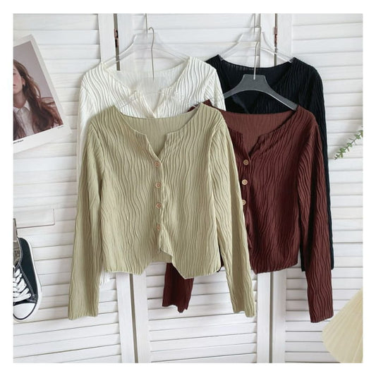 Long-Sleeve Plain V-Neck Top Crop Asymmetrical